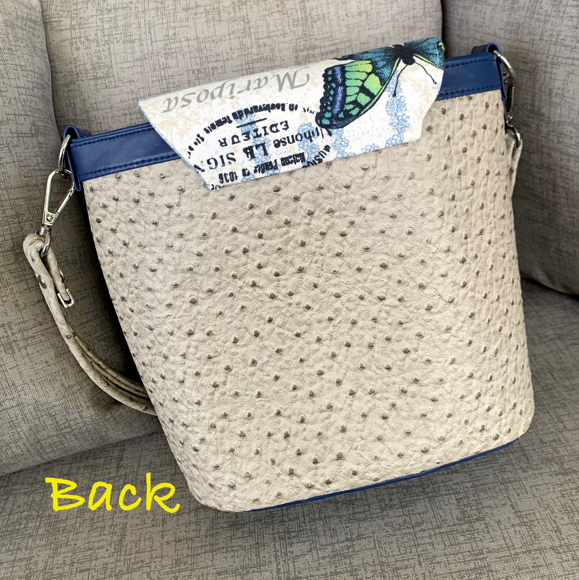 This lovely bag is roomy with many compartments for organization! The main part of the bag is made from a beautiful, ecru, faux ostrich leather with navy faux leather edging and bottom. The flap is made of a light butterfly-themed cotton canvas. Inside there are two large zipper/slip pocket combinations. All of your items will be kept safe by a recessed zipper underneath the butterfly flap with a flip-lock closure.