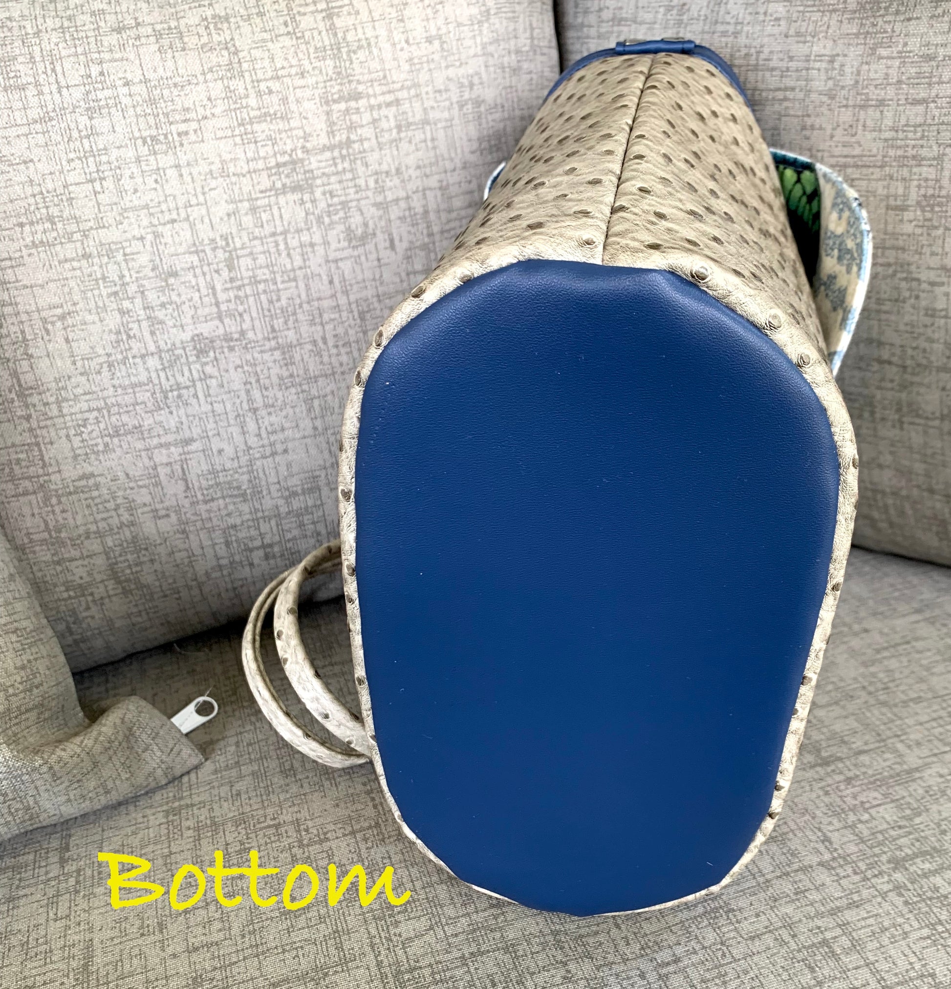 Exterior Fabric: Ecru faux ostrich leather, navy faux leather, Butterfly-themed light cotton canvas