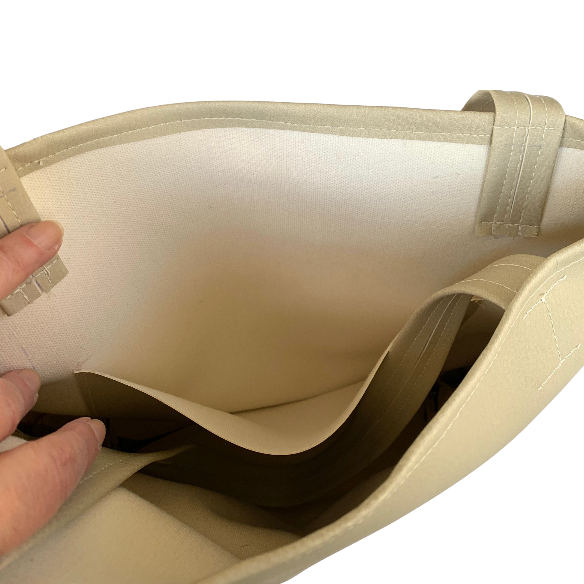 Exterior: Beige leather-like vinyl with 2 deep, front slip pockets. Informal embroidery on each side.