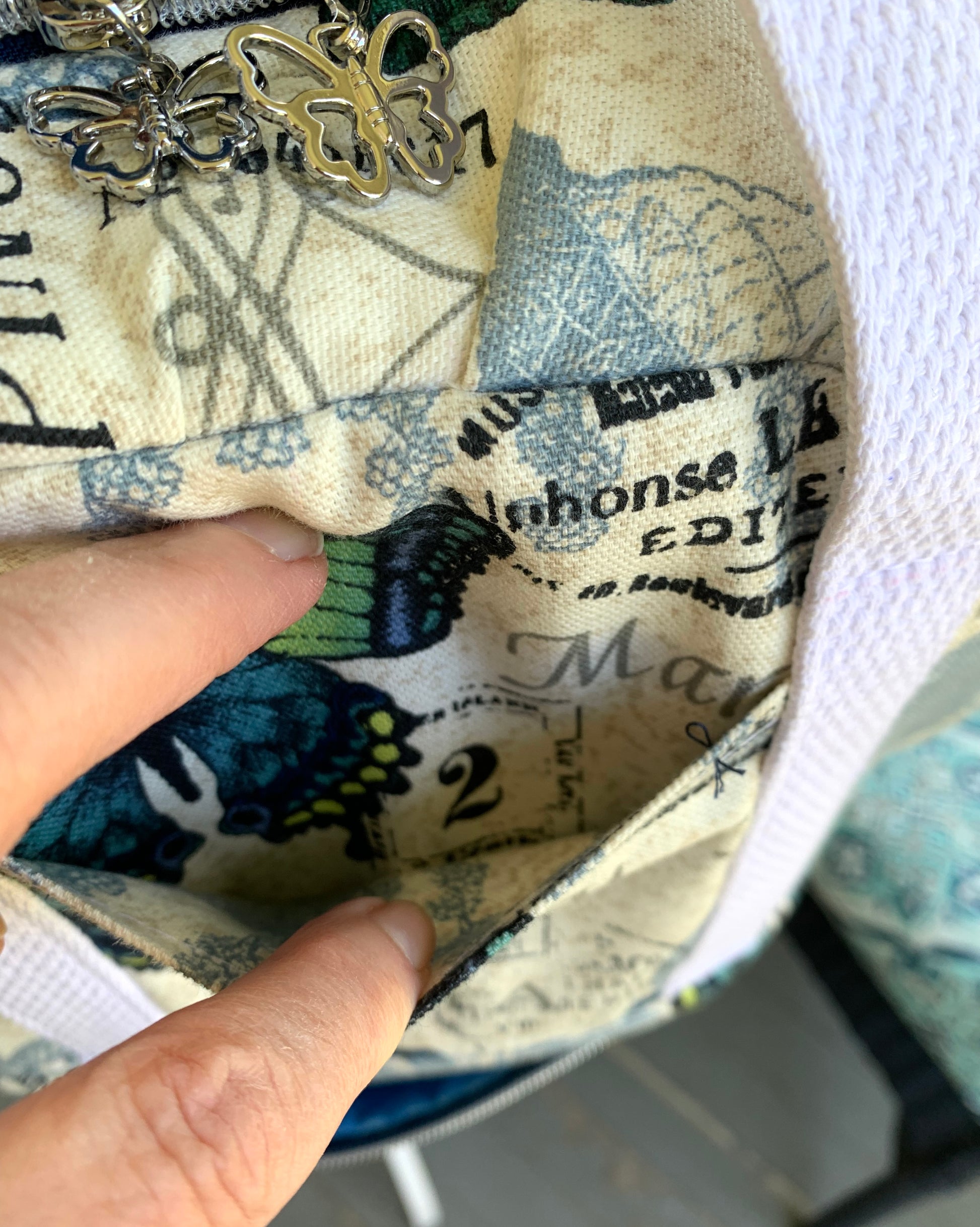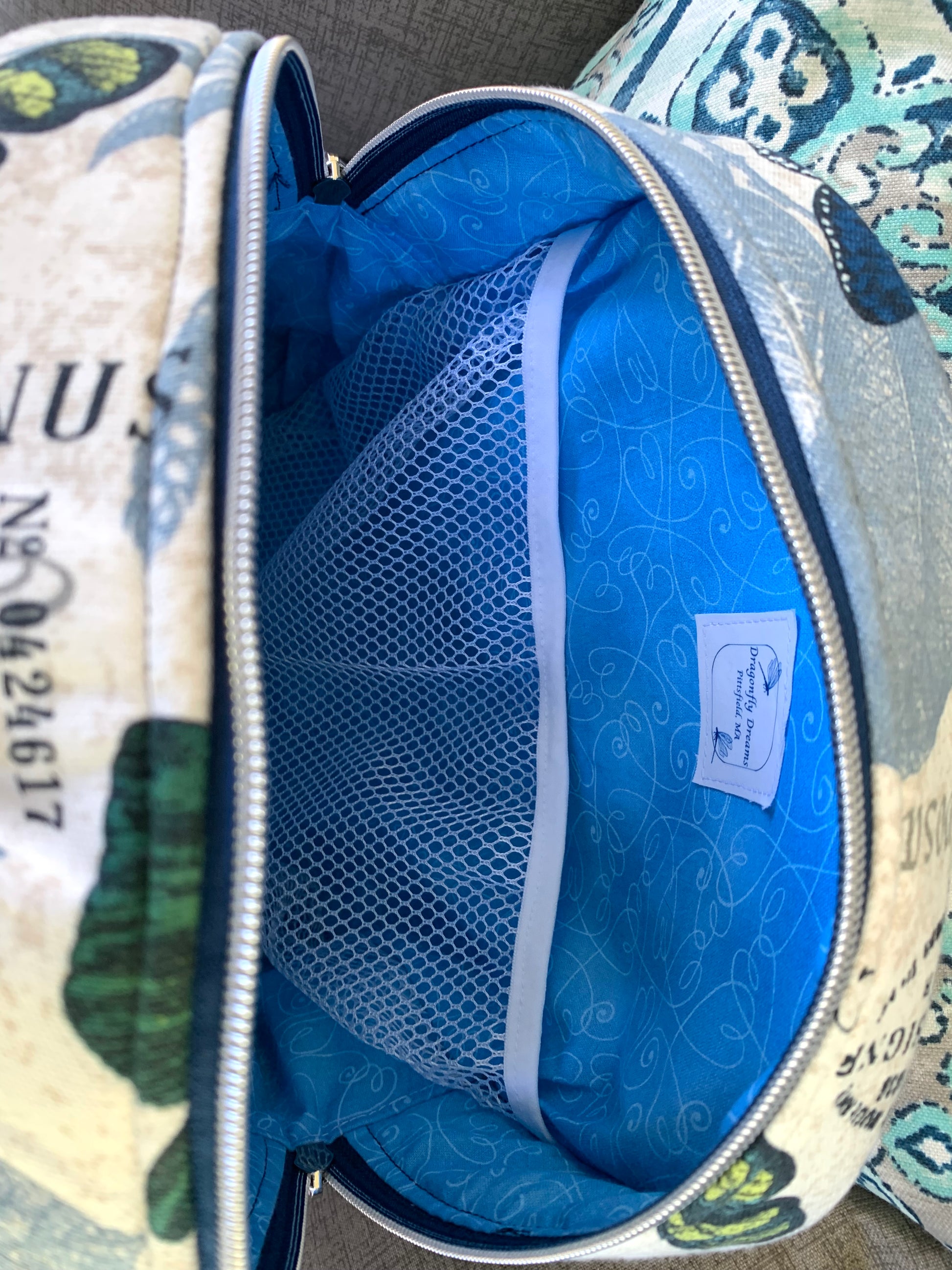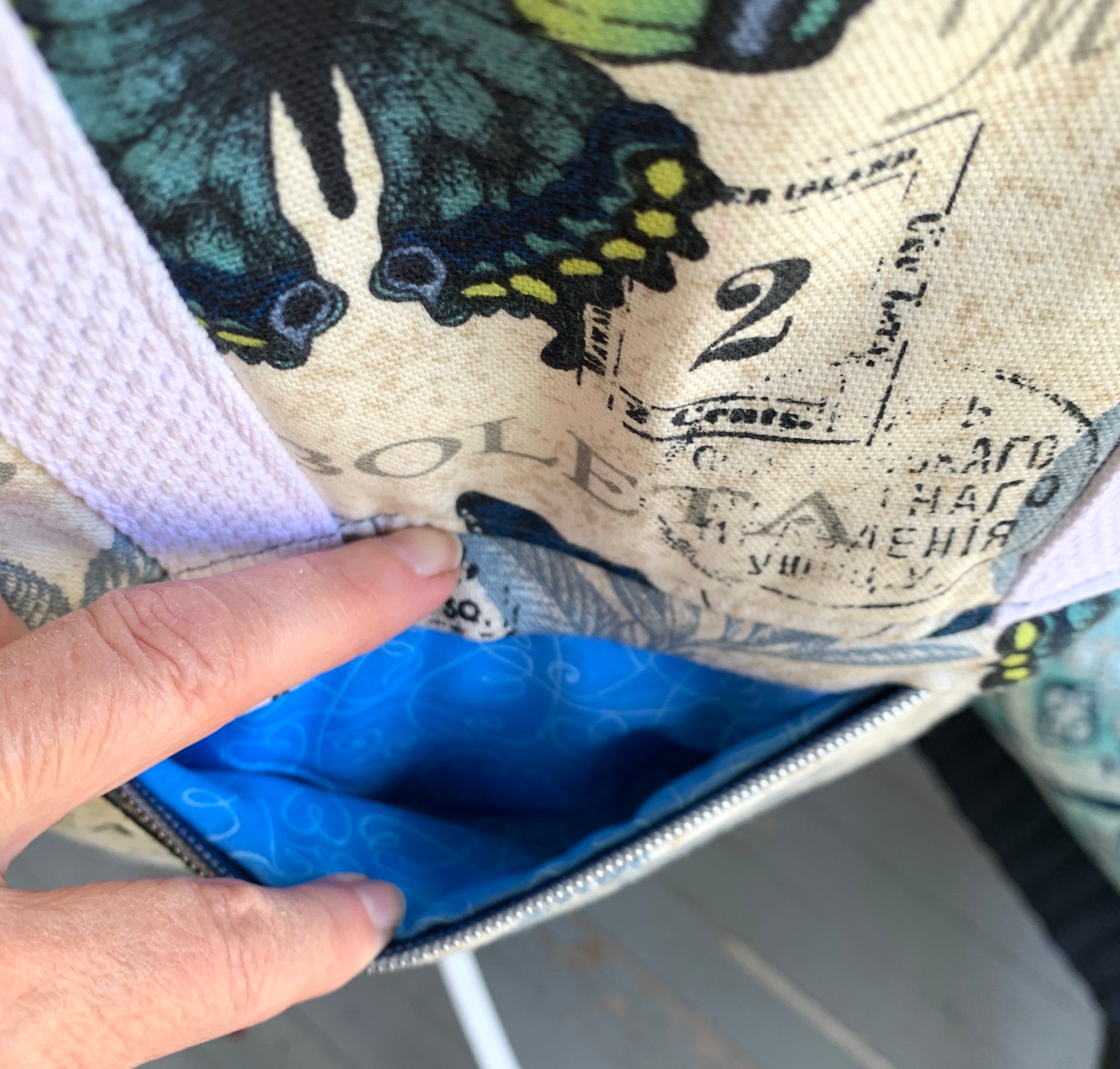 The print of the backpack exterior is beautiful butterflies in shades of blues and greens on a tan-mottled, nature-colored background along with blue screen printing of plants and nature-related Latin words in black and gray.