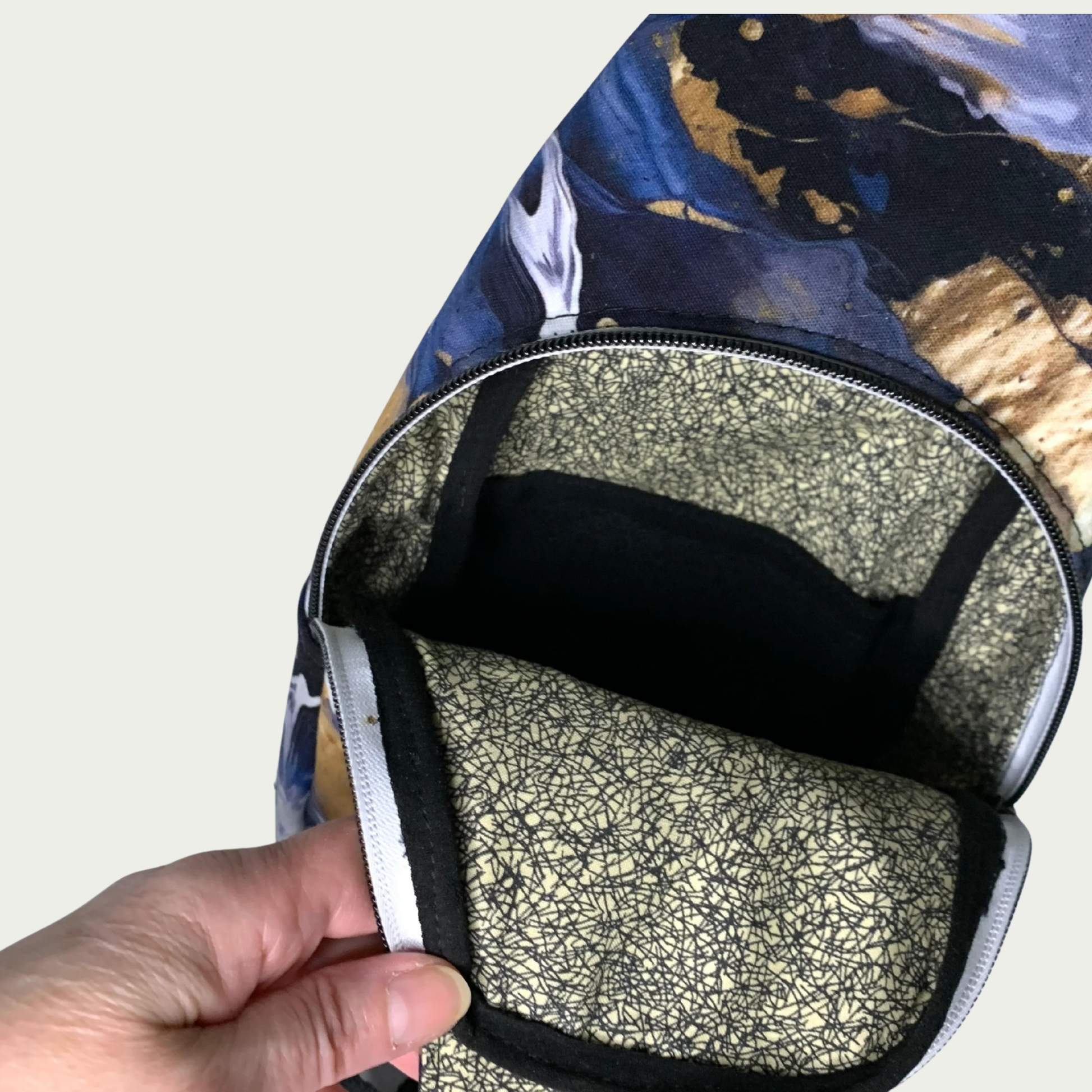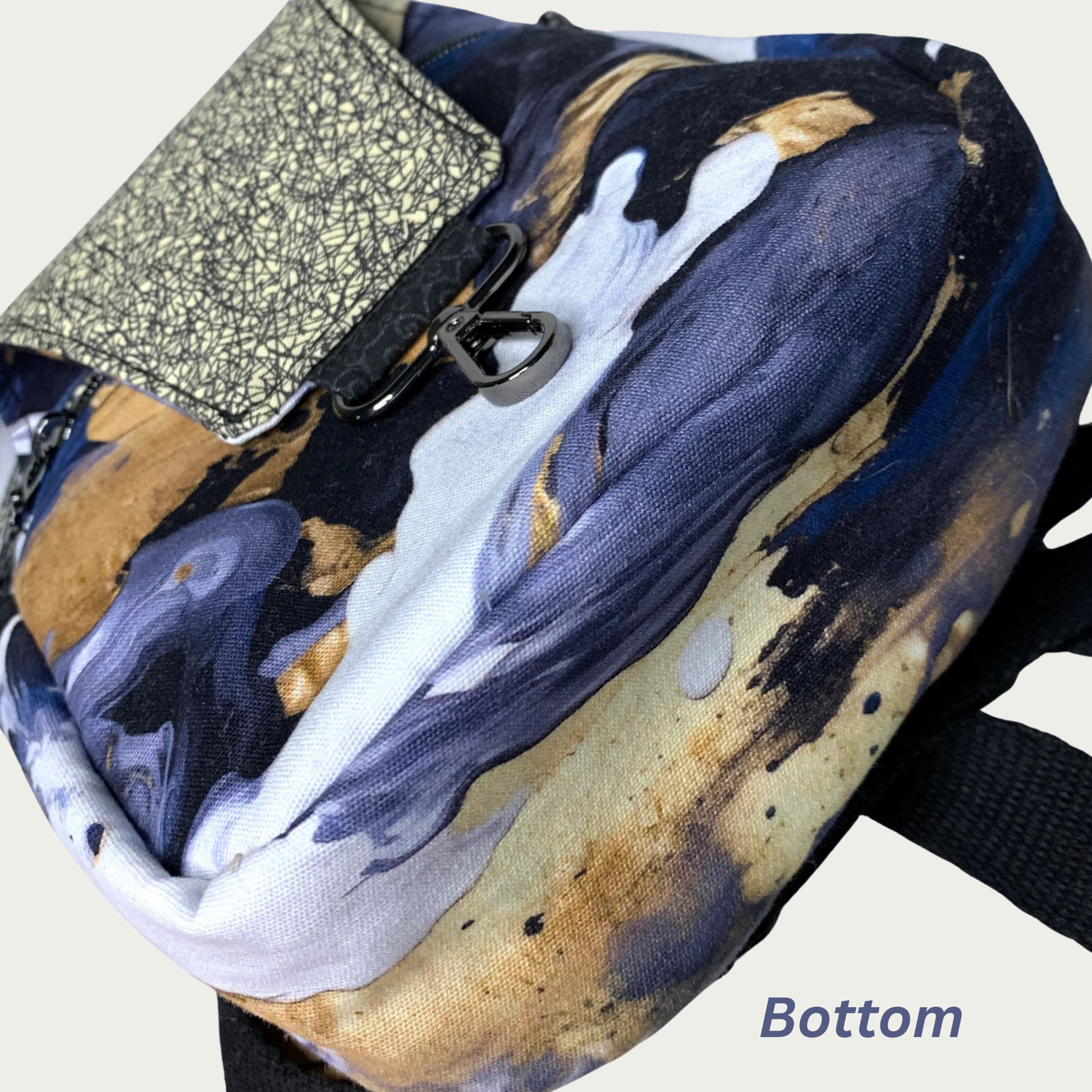 Exterior: A beautiful, waterproof cotton canvas in a swirl of colors such as black, navy, white, tan, and gold, that makes it wonderfully unisex. The little bit of black cotton woven fabric for the connector tabs and front inside panel are not waterproof.