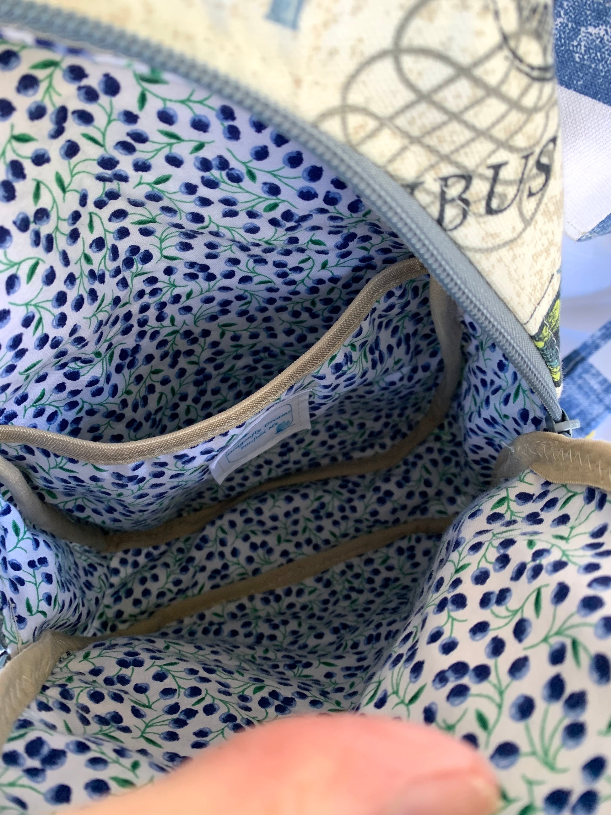 Exterior: Cotton canvas with a beautiful butterfly / nature print. Colors include shades of blues and greens, natural, tan, black, and gray. The strap is also made from a cotton canvas of plaid in coordinating blue denim-like colors.