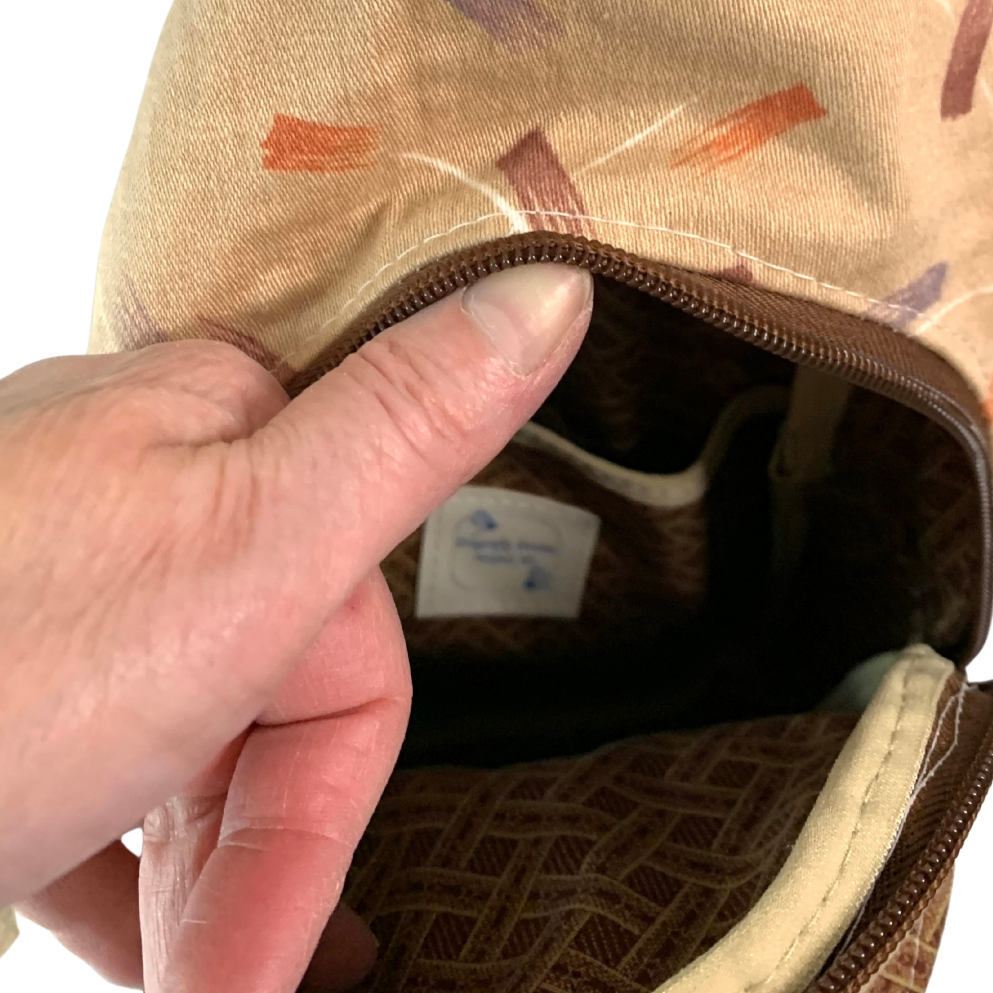 Exterior: A tan, heavy-weight woven cotton with muti-colored paintbrush strokes.