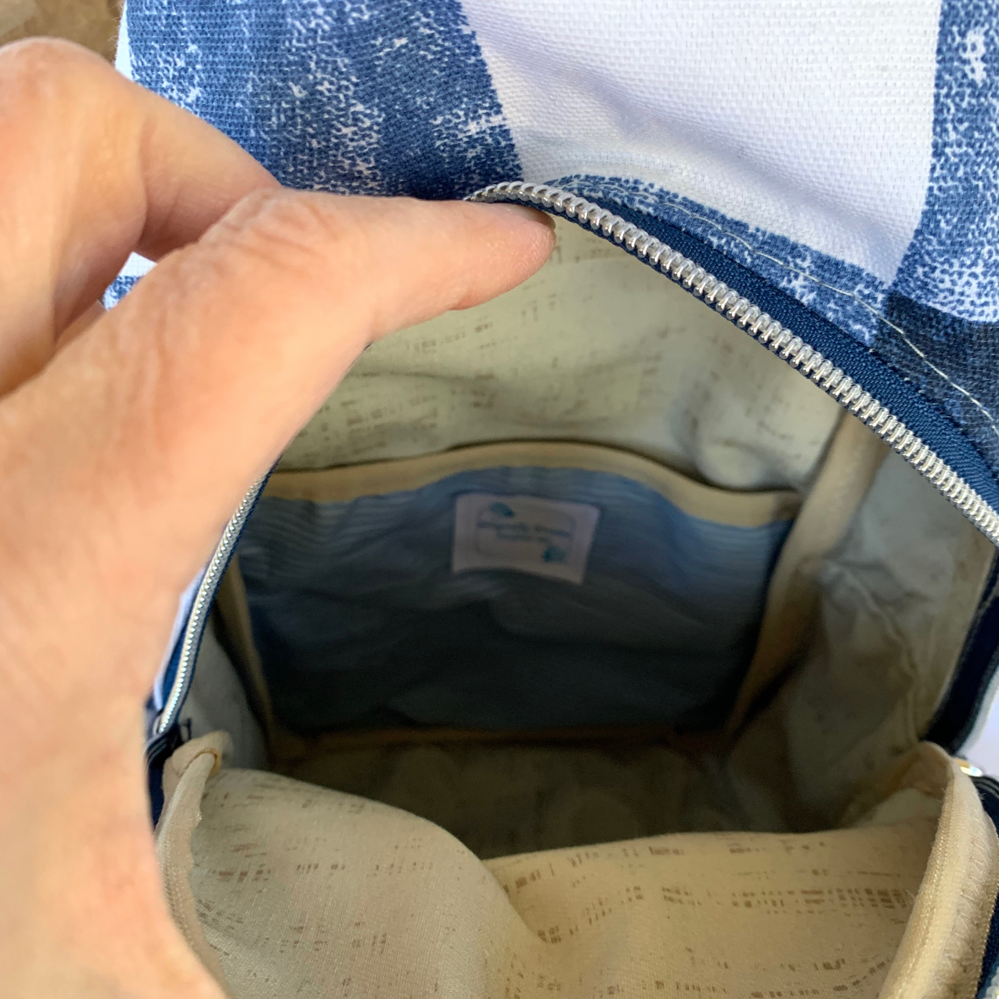 Exterior: Navy, denim-like blue and white plaid cotton canvas. Denim accent fabric on strap and the front inside panel.