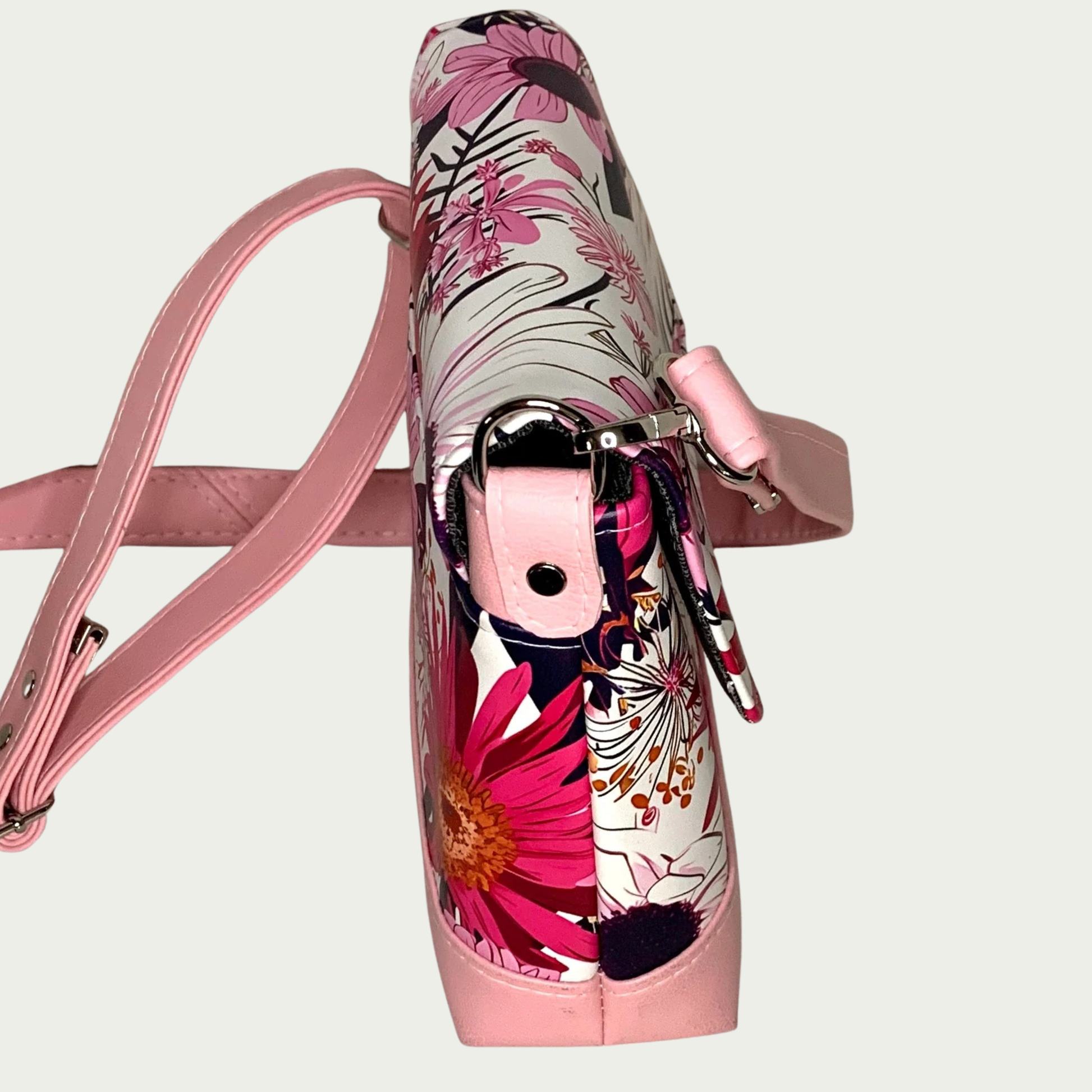 Meet your new favorite accessory: the Iris Mini in Pretty in Pink. Don't let its petite size fool you—this crossbody packs serious organizational charm with a flip-top closure, zippered compartment, and slip pocket to corral your essentials. Swap the strap around to match your vibe: crossbody for on-the-go freedom, shoulder-slung for everyday comfort, or hand-carried for those polished moments. Dressed in vibrant pink floral printed vinyl accented with solid pink touches, it's a joyful little statement piece that goes everywhere you do.