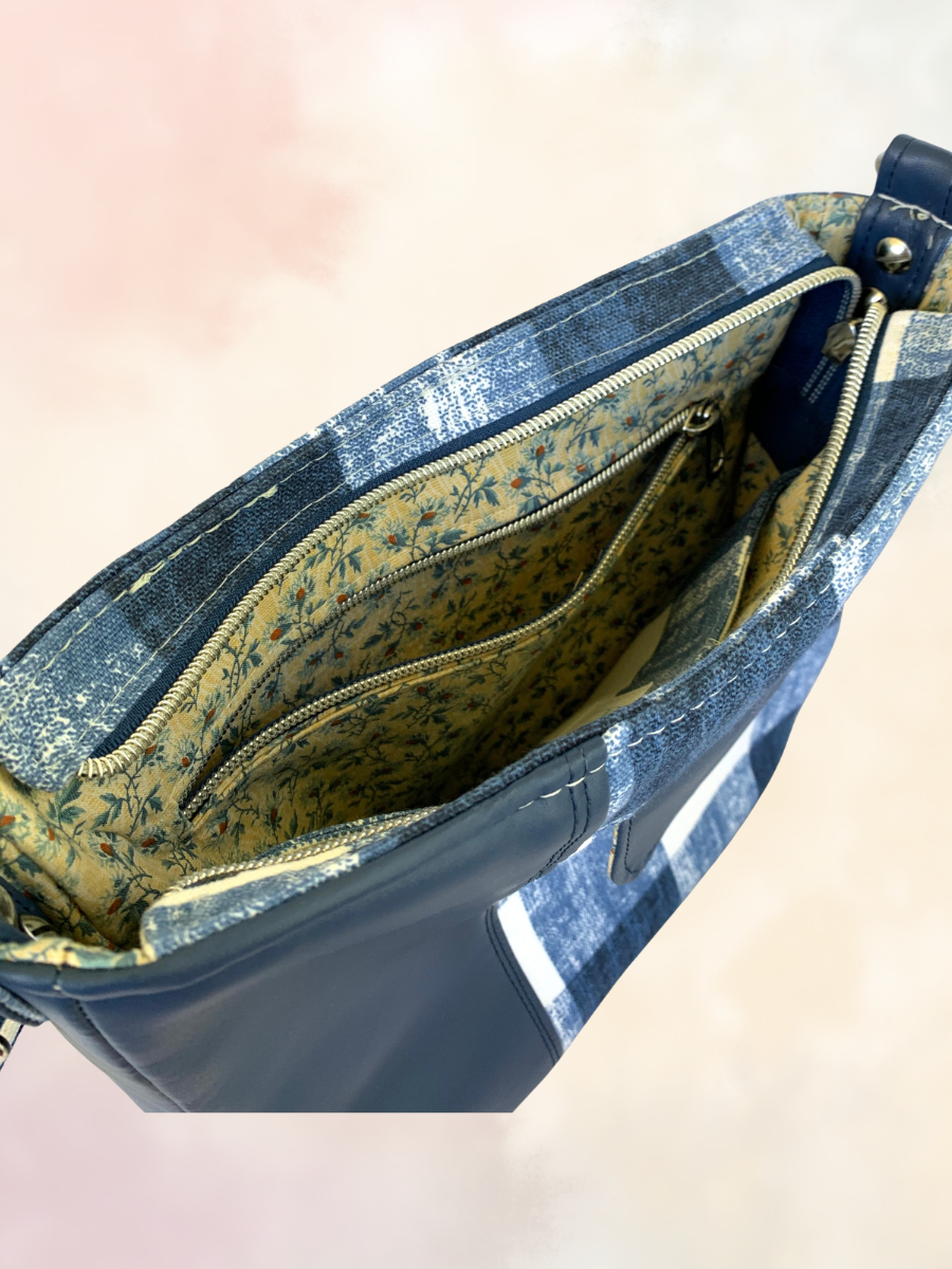 Unisex Messenger Bag - Navy Vinyl and Plaid Canvas